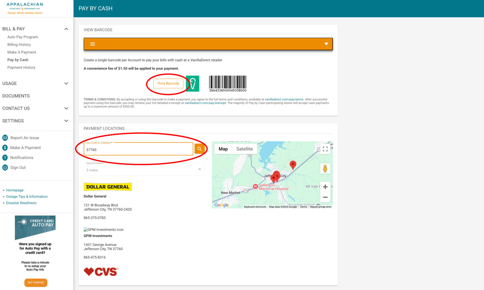 VanillaDirect provides real-time cash payment solutions at Dollar General, Family Dollar, Walgreens, CVS Pharmacy and others. To make a payment at one of the VanillaDirect locations, you must have a barcode. To obtain a barcode, go to www.aec.smarthub.coop and follow the directions below (you must have your AEC coount number to sign into SmartHub). If you have downloaded the SmartHub app onto a mobile device, this can be done from that as well. When paying at a VanillaDirect location, it is cash only and there is a $1.50 service charge per transaction.